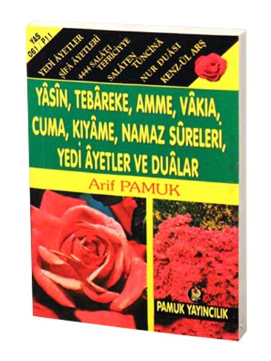 Yasin. Tebareke. Amme. Vakıa. Cuma. Kıyame. namaz sureleri. yedi ayetler. şifa ayetleri. Nur duası. Kenzül Arş duası ve daha birçok duanın Arapça ve Latince metinlerinin büyük puntolarla dizildiği bir eser.